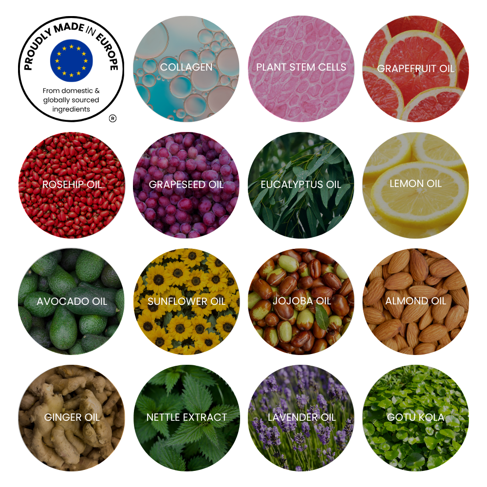 • Botanical oils – Lemon, grapefruit, grape seed, sunflower & eucalyptus